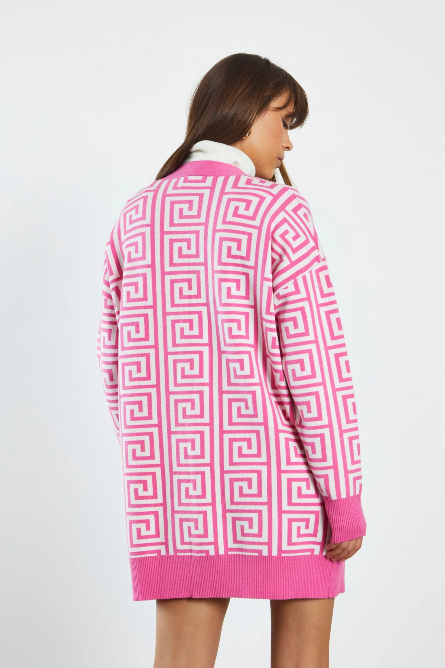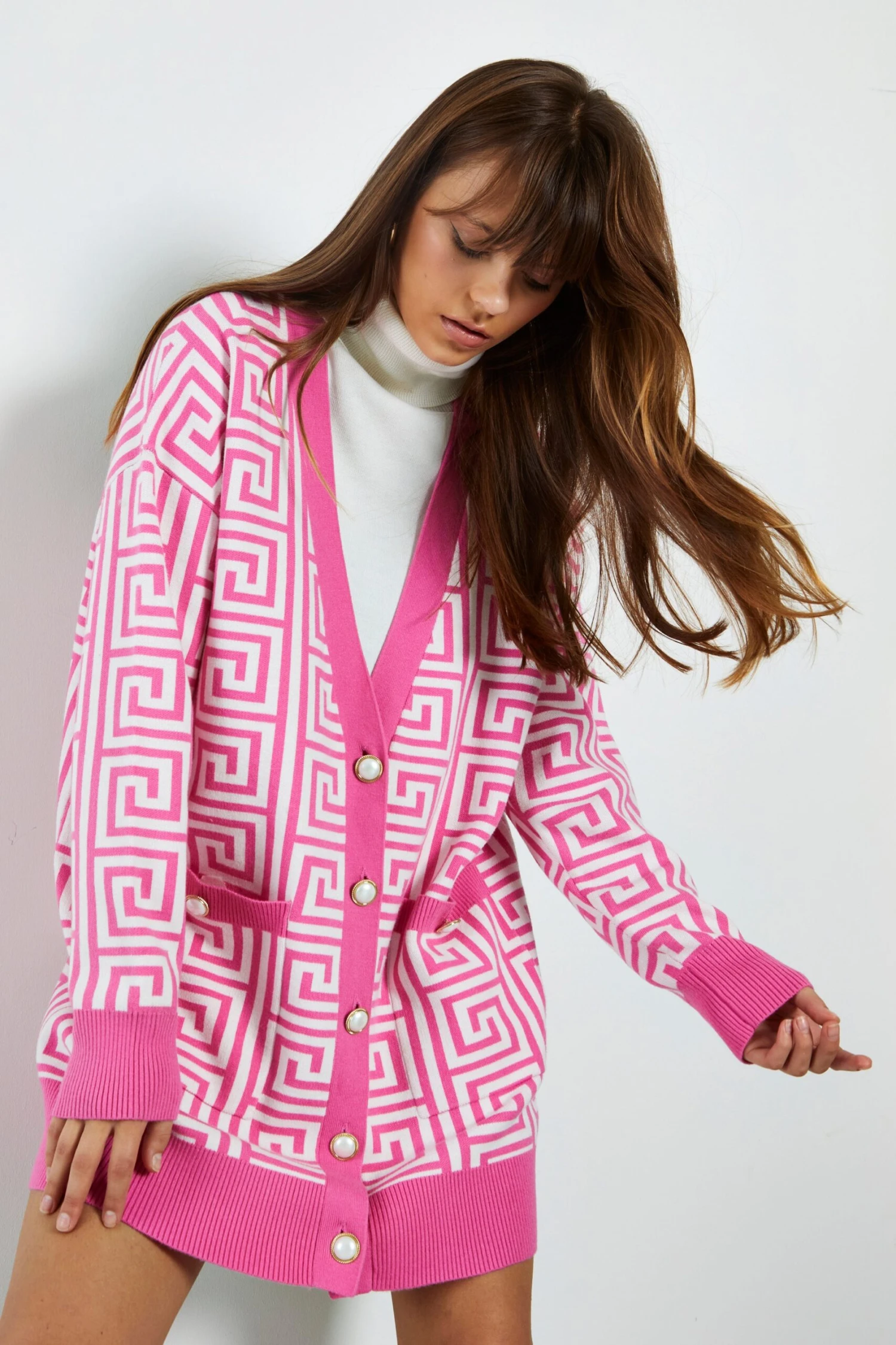 Glamorous Pink Geo Oversized Knitted Cardigan. Stay cosy this season and layer up with this oversized cardigan. Featuring dropped sleeves, pearl gold buttons and front pockets, this cardigan is a must have for your autumn wardrobe. Pair easily over jeans for a cosy fit.