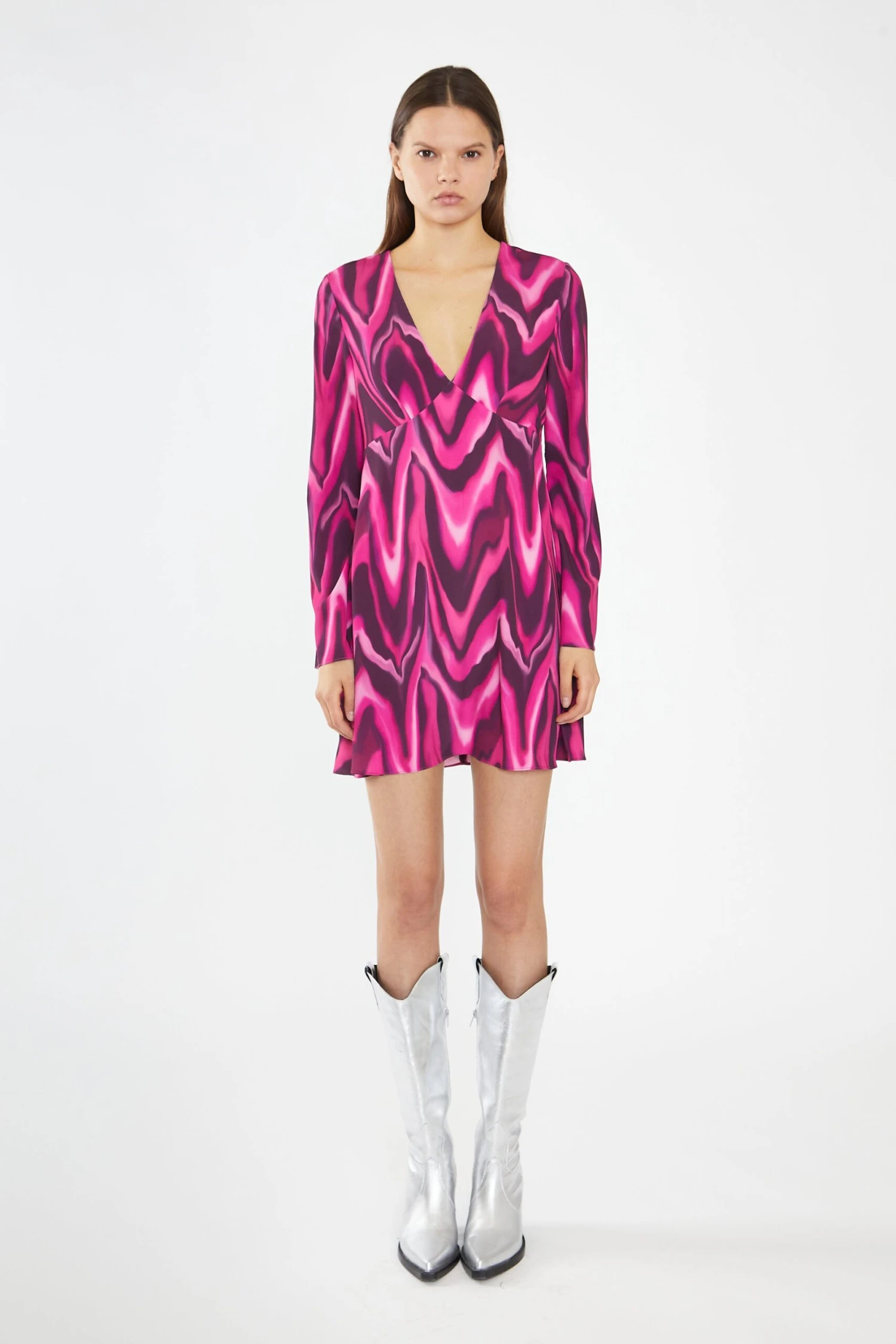 Glamorous Womens Pink Multi-Blurred Wave Flared Sleeve Mini-Dress. Introducing our stunning Pink Multi-Blurred Wave Flared Sleeve Mini-Dress! This eye-catching dress features a flattering V-neck, flowy flared sleeves, and a fitted waist for a feminine silhouette. Perfect for any occasion, the mini length adds a touch of playfulness to this already gorgeous dress.