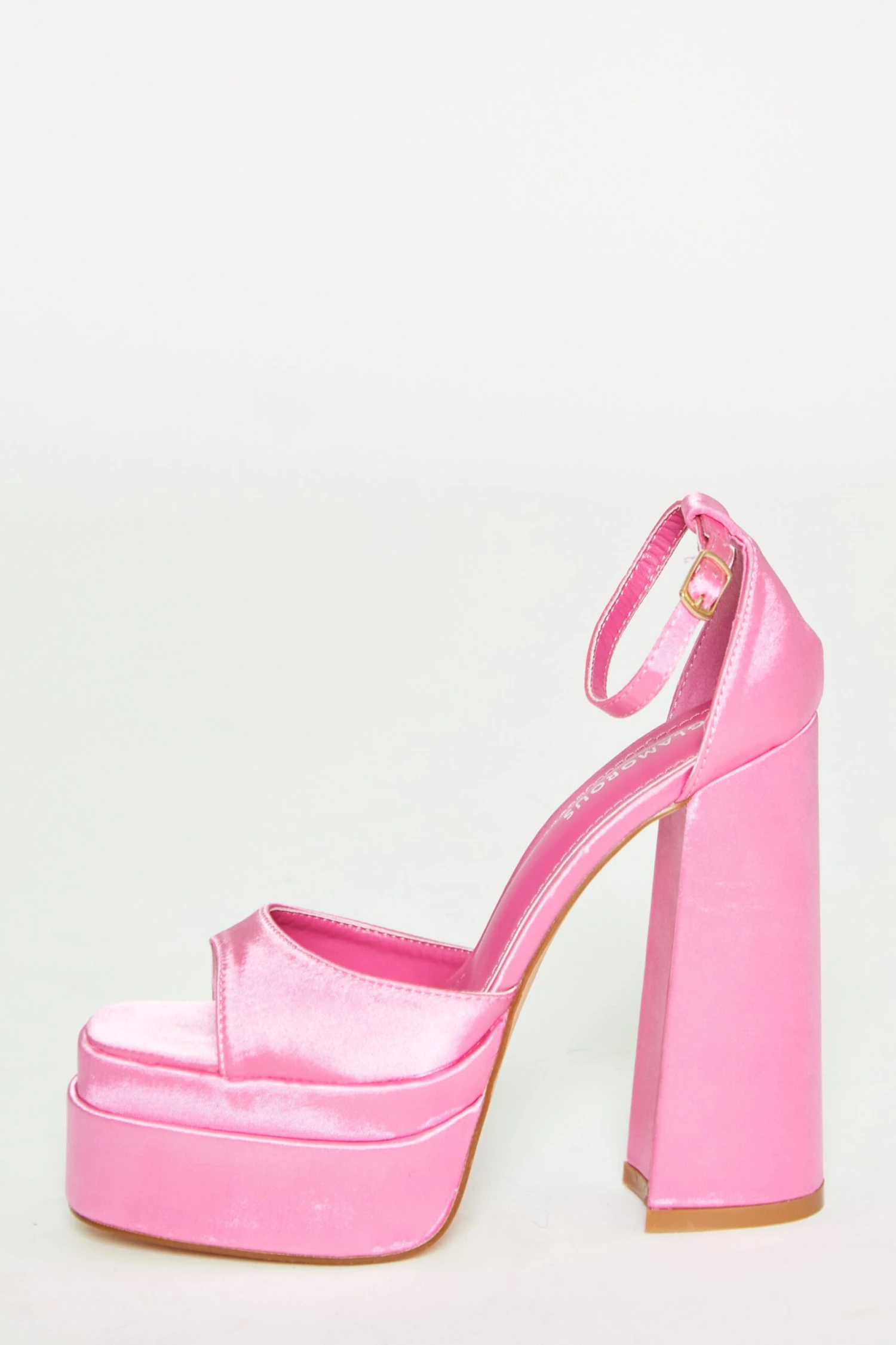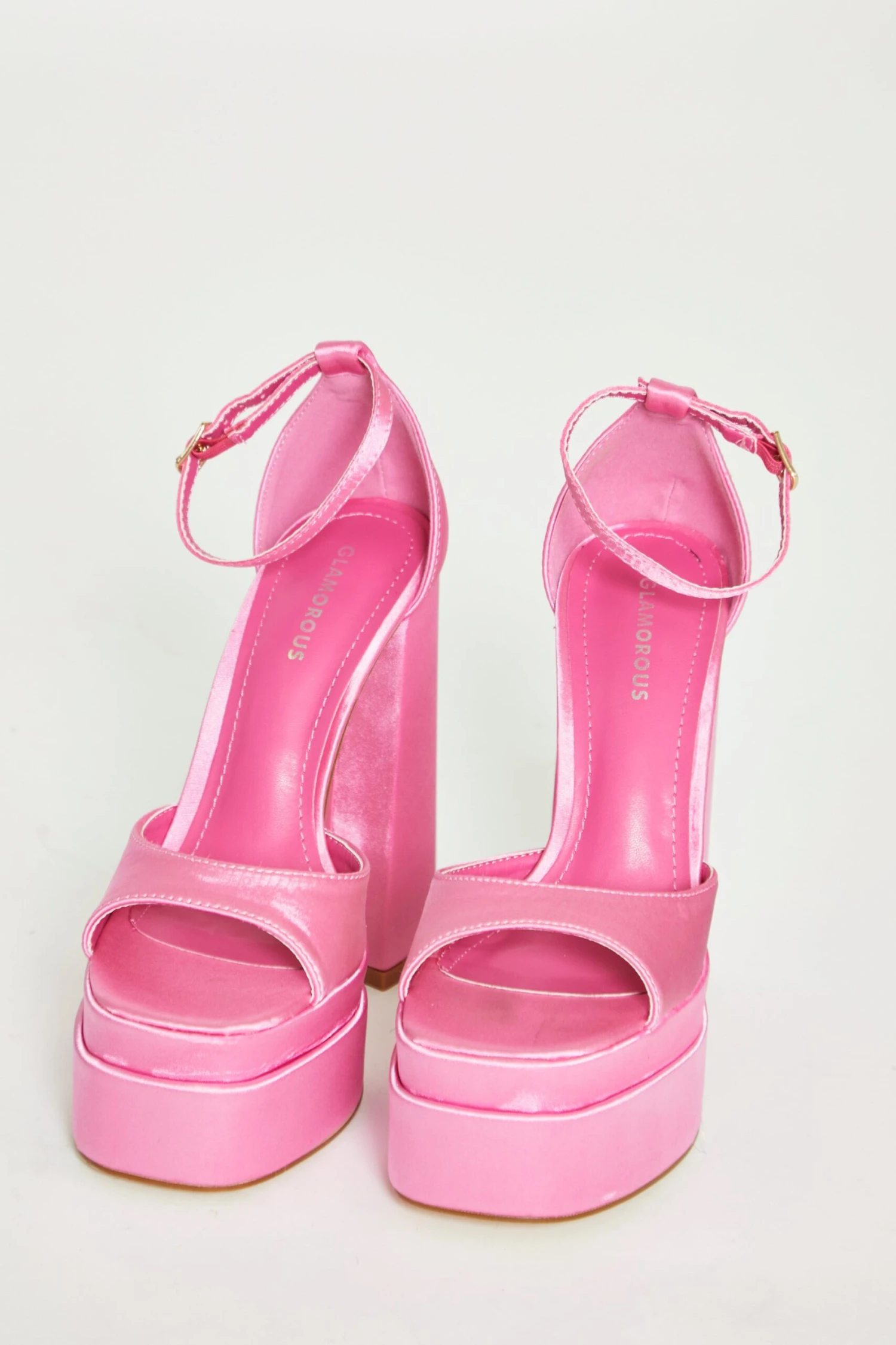 Glamorous Pink Satin Open Toe Platform Heels. Add one of this seasons biggest trends to your wardrobe with these platform heels. Featuring a platform block heel, a double sole and an open toe, these heels wont fail to impress! Designed to make a statement, these stunning heels are sure to elevate every outfit.