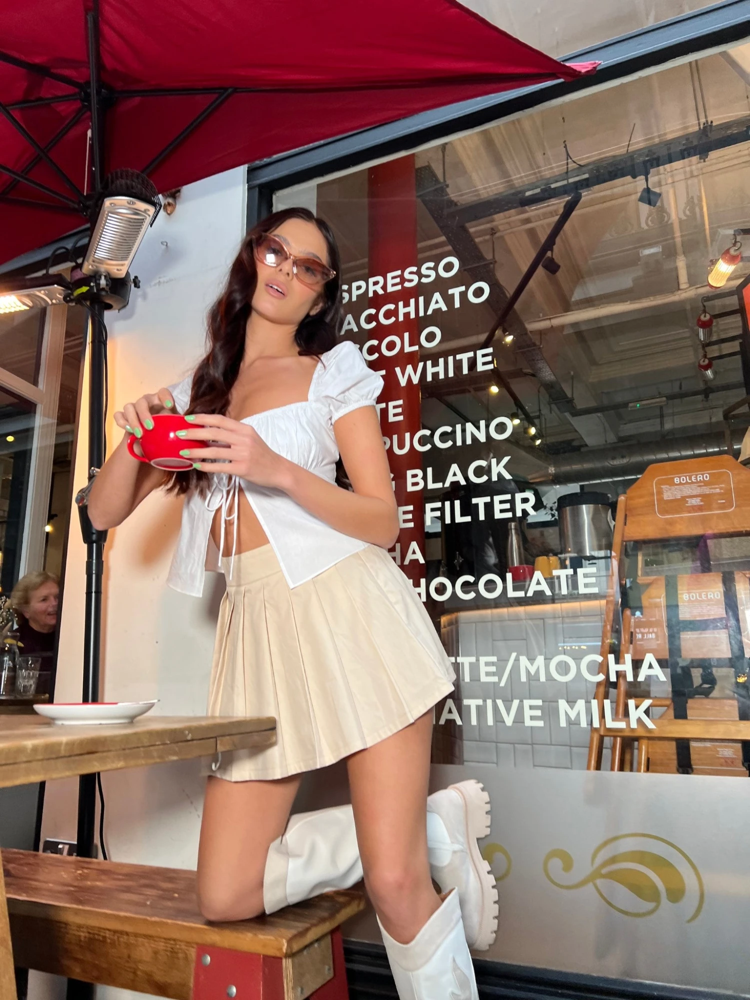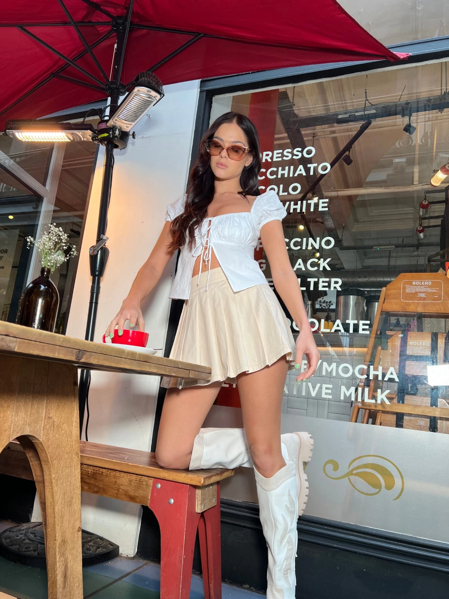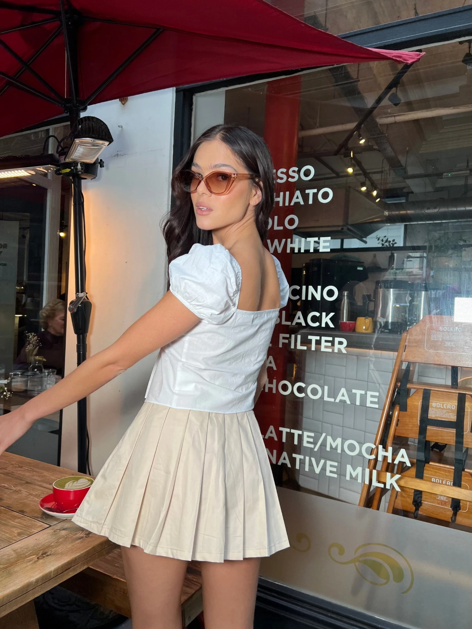 Glamorous Womens Stone Mid-Rise Pleated Mini-skirt. This stone mini skirt is the perfect low key piece that will go with anything! Featuring a pleated design and mid-rise waist, this versatile piece will not fail in elevating any outfit! Pair with a crisp white crop top for a super on trend look.