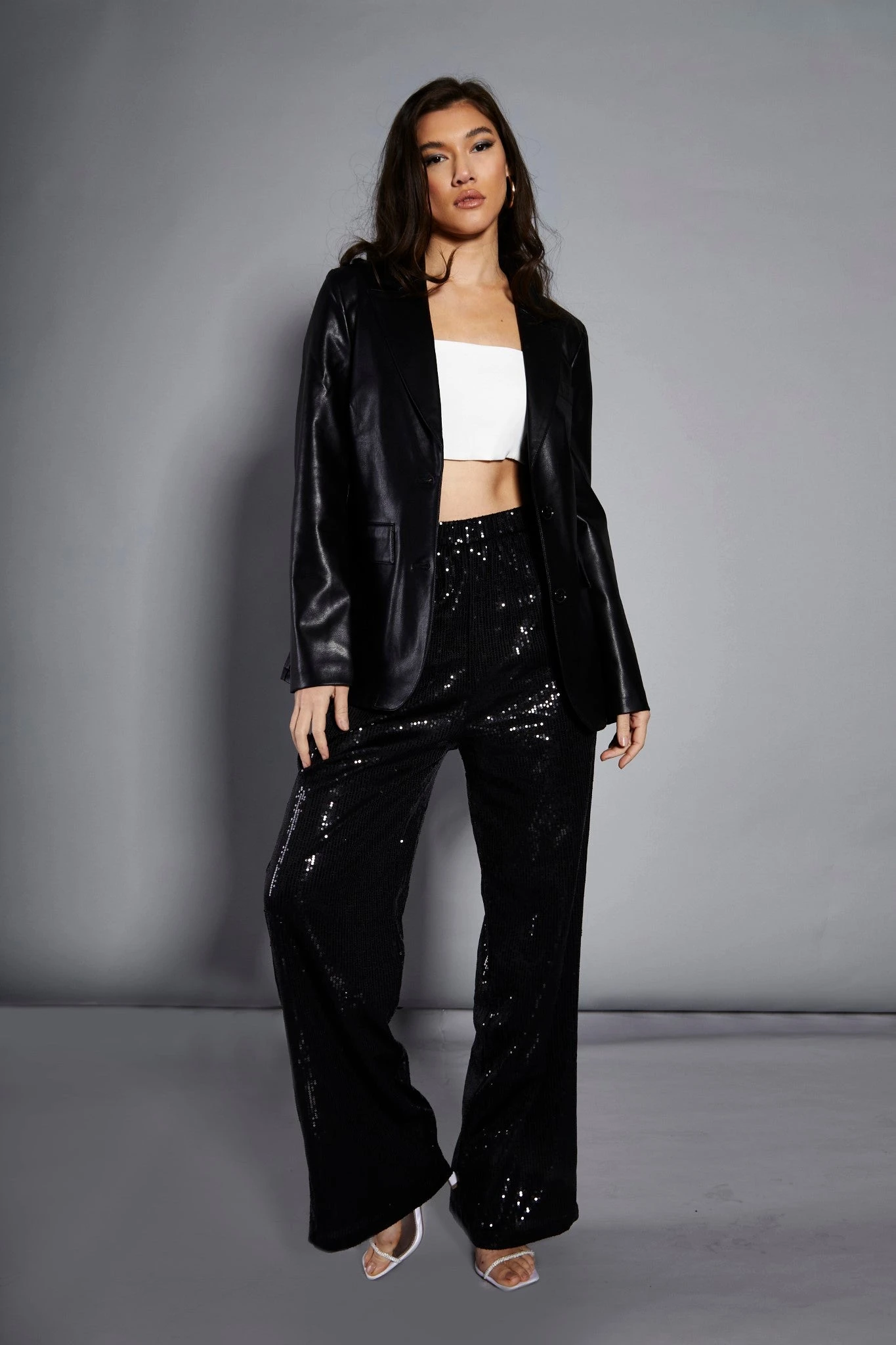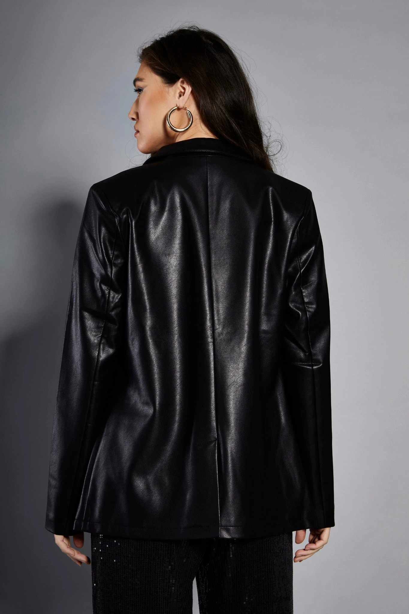 Glamorous Studio Black PU Blazer Jacket. This Blazer is the perfect layering piece this autumn. Featuring a single breasted fit, with functioning pockets. Looks great teamed with jeans and trainers or elevate the look with a mini dress some strappy heels to take it from day to night.