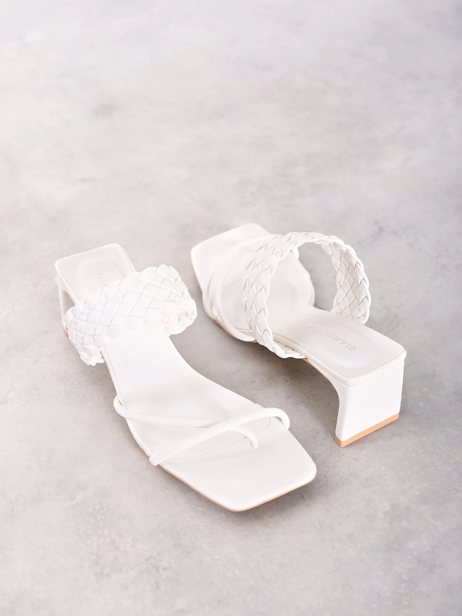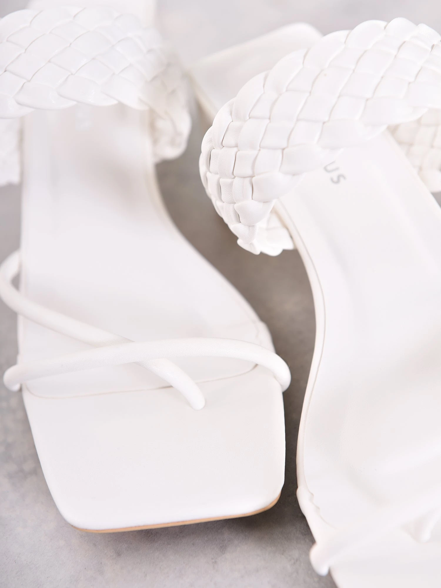 Glamorous Womens White Woven Heeled Mule Sandal. This seasons wardrobe must have, these strappy toe post heels are the statement piece you need in your life. Featuring woven detail, block heel and square toe, simply style with a strappy dress for an elevated evening look.