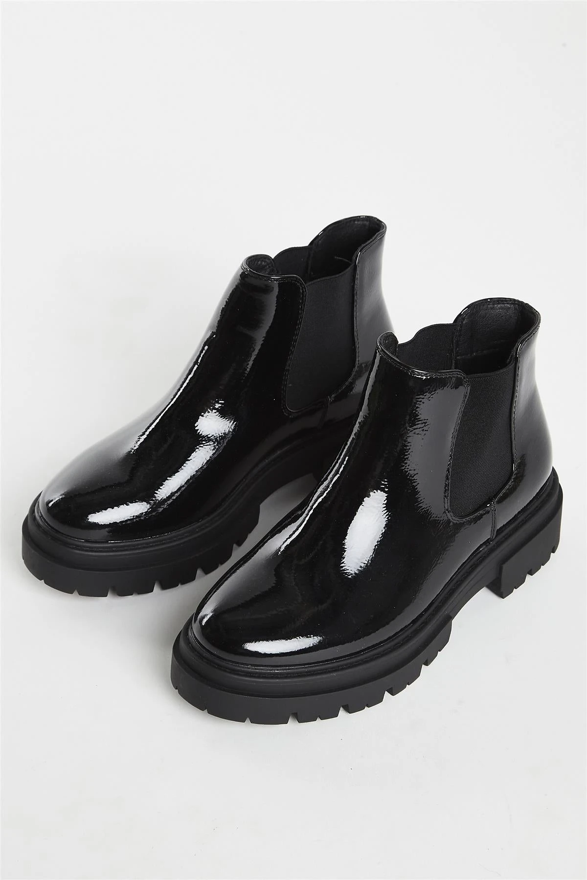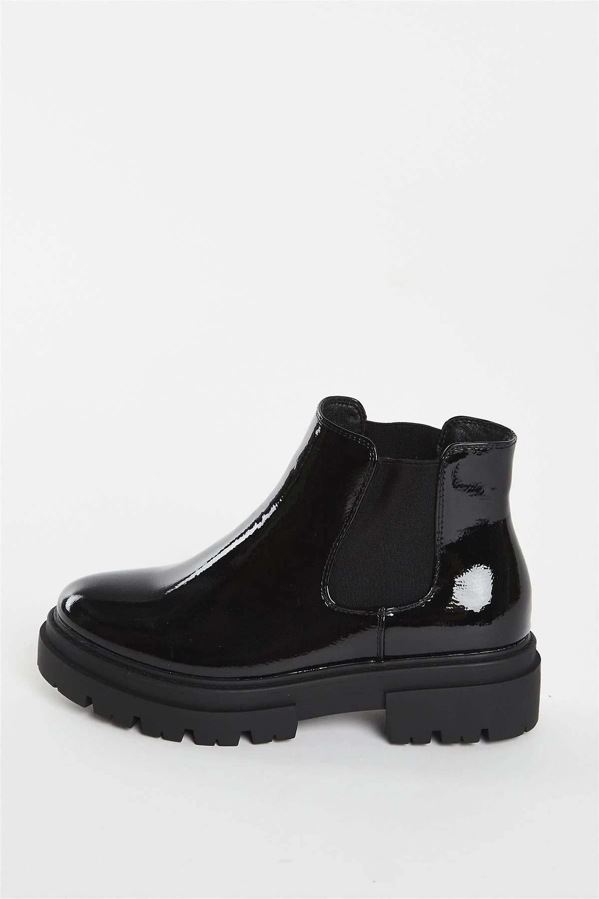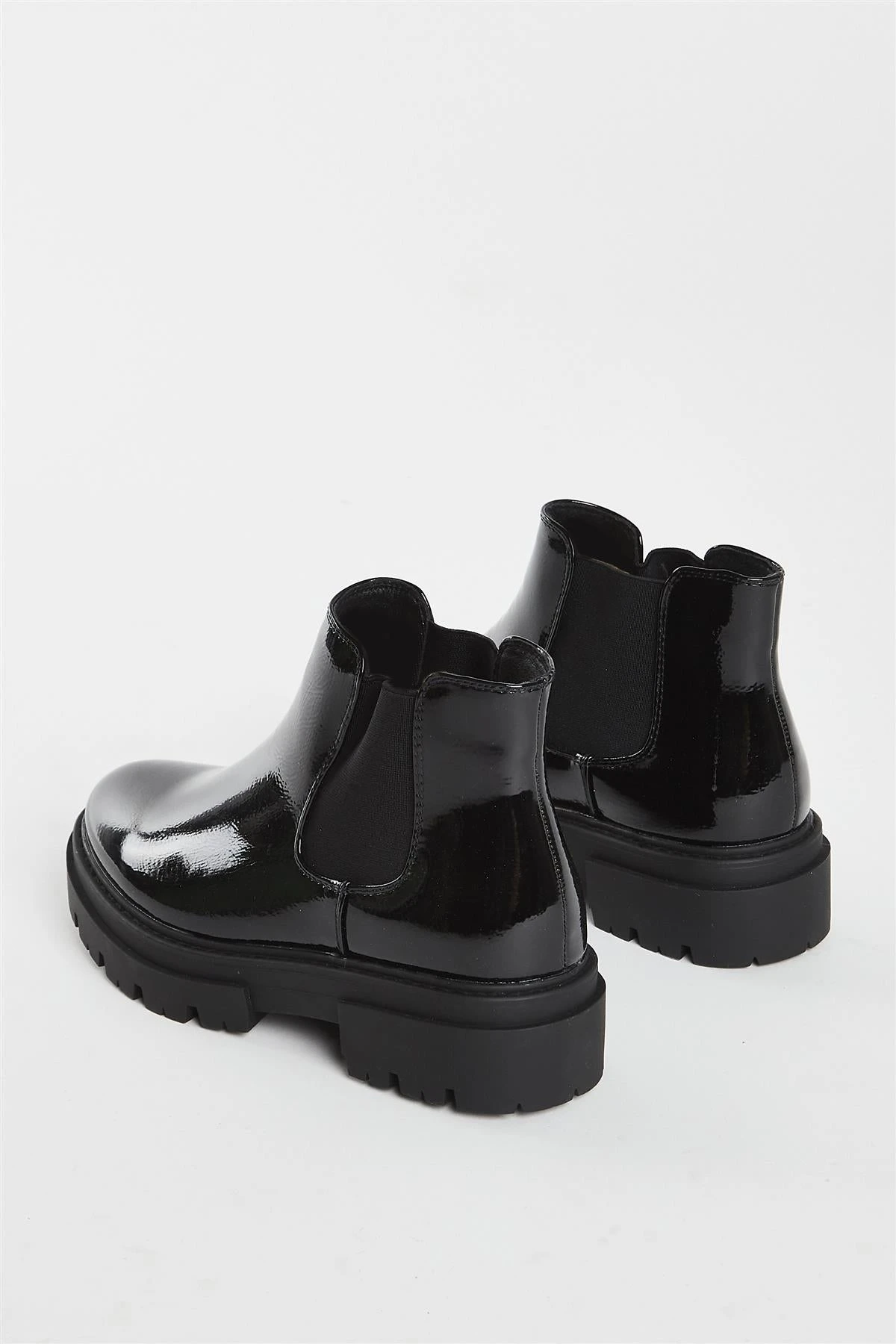 Glamorous Womens Black Crinkle PU Ankle Boots In Wide Fit. Step out in style with these sleek, slip-on black patent ankle boots! Sporting an ultra-cool elasticated stretch and a comfortable chunky heel, you can show off your unique fashion sense while keeping your feet happy.