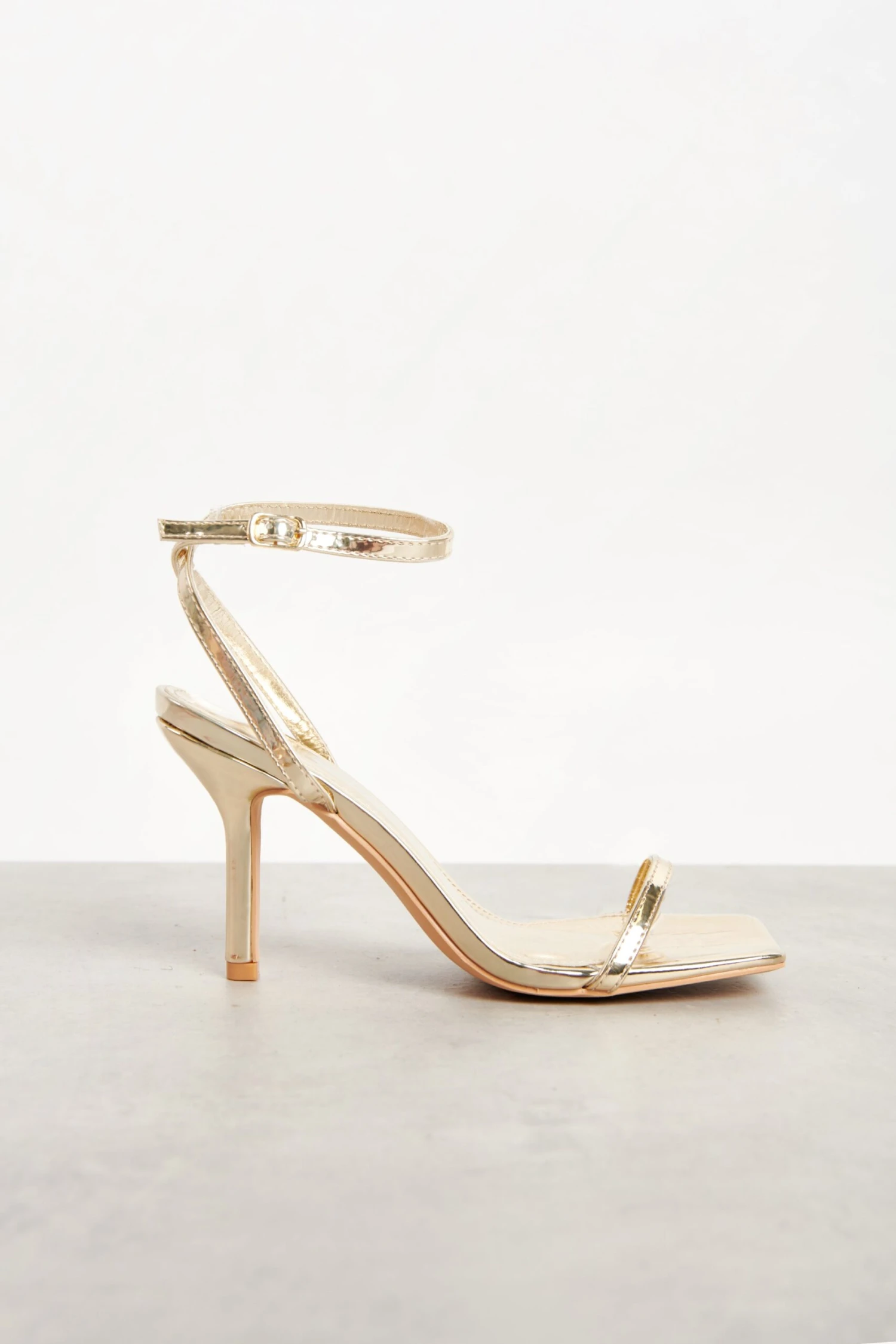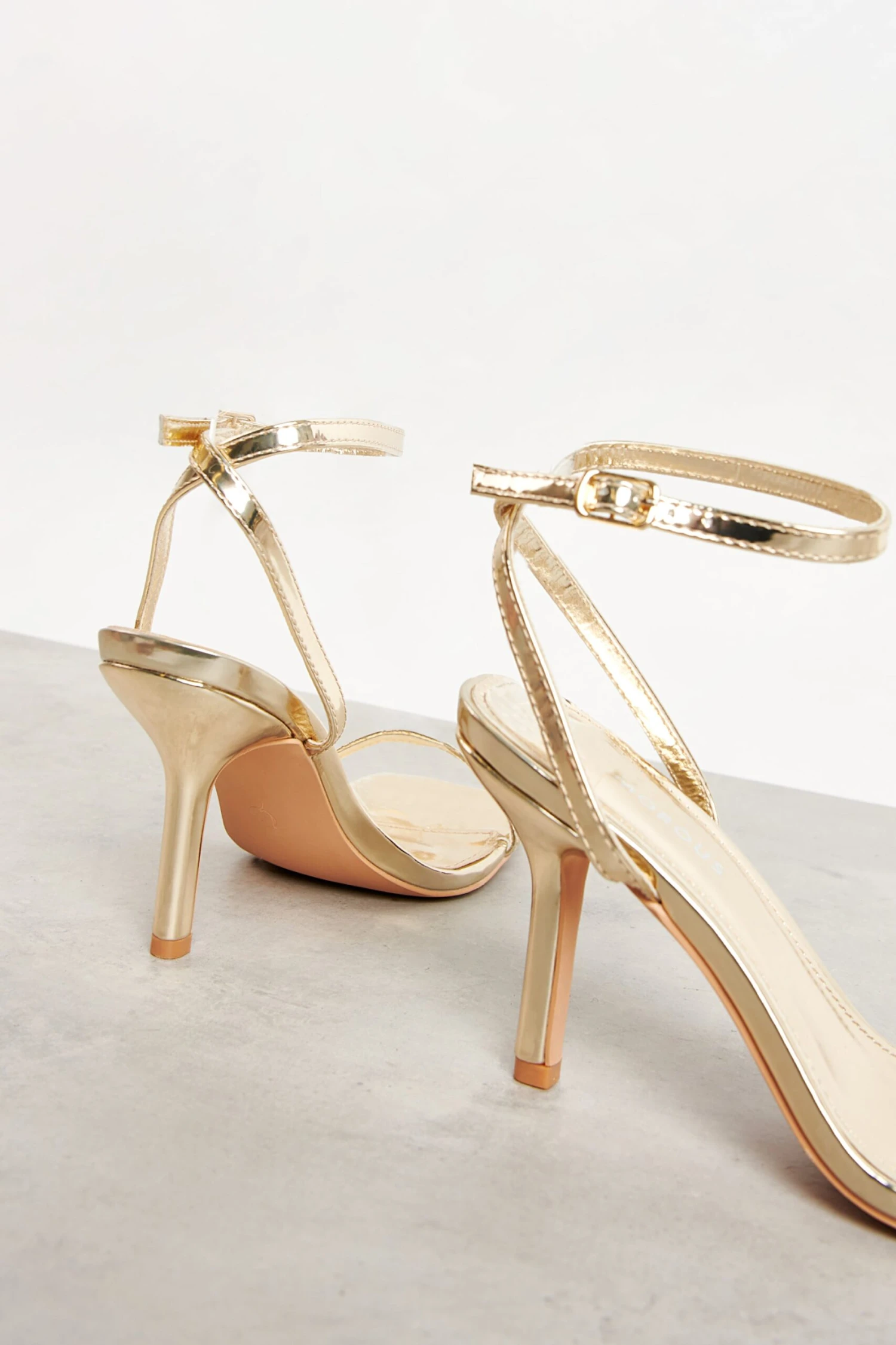 Glamorous Wide Fit Womens Gold Barely There Strappy Heels. Dance the night away in these gorgeous strappy heels. The adjustable straps in and buckle fastening give you a secure fit style with for all-night dancing while the open toe and stiletto heel create a slick sophisticated look. Perfect to style with for any night out!