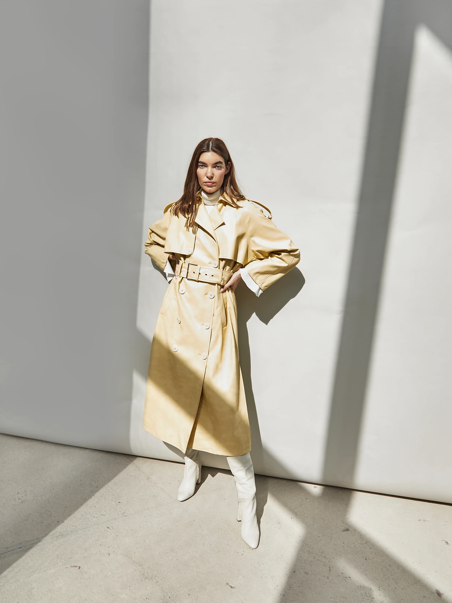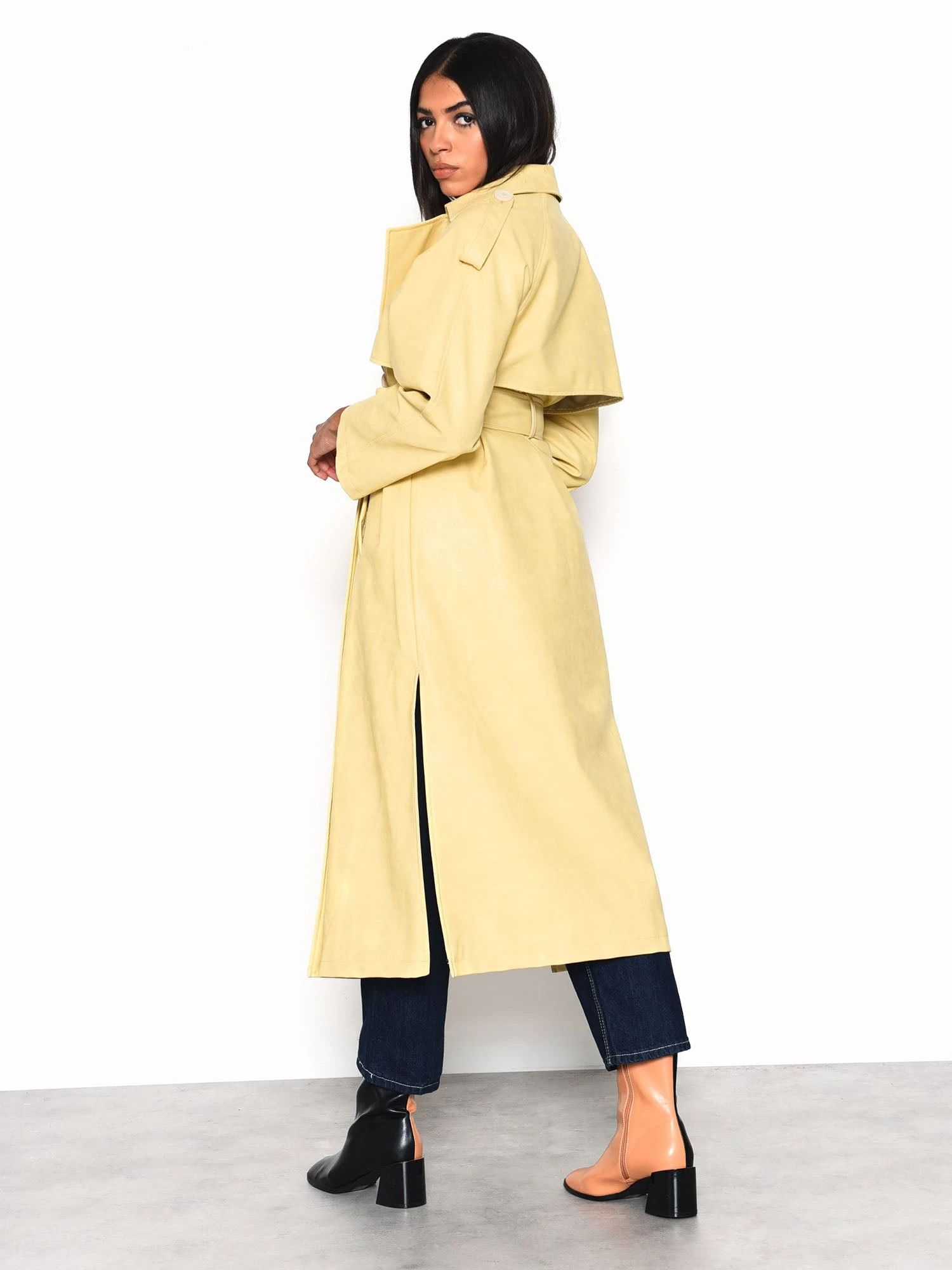 Glamorous Womens Yellow Leather Longline Trench Coat. Stay cosy this season and layer up with this yellow long coat. Timeless and super versatile, this coat will always look effortless and elegant. Pair with a white strappy dress and some heels for an elevated look.Â