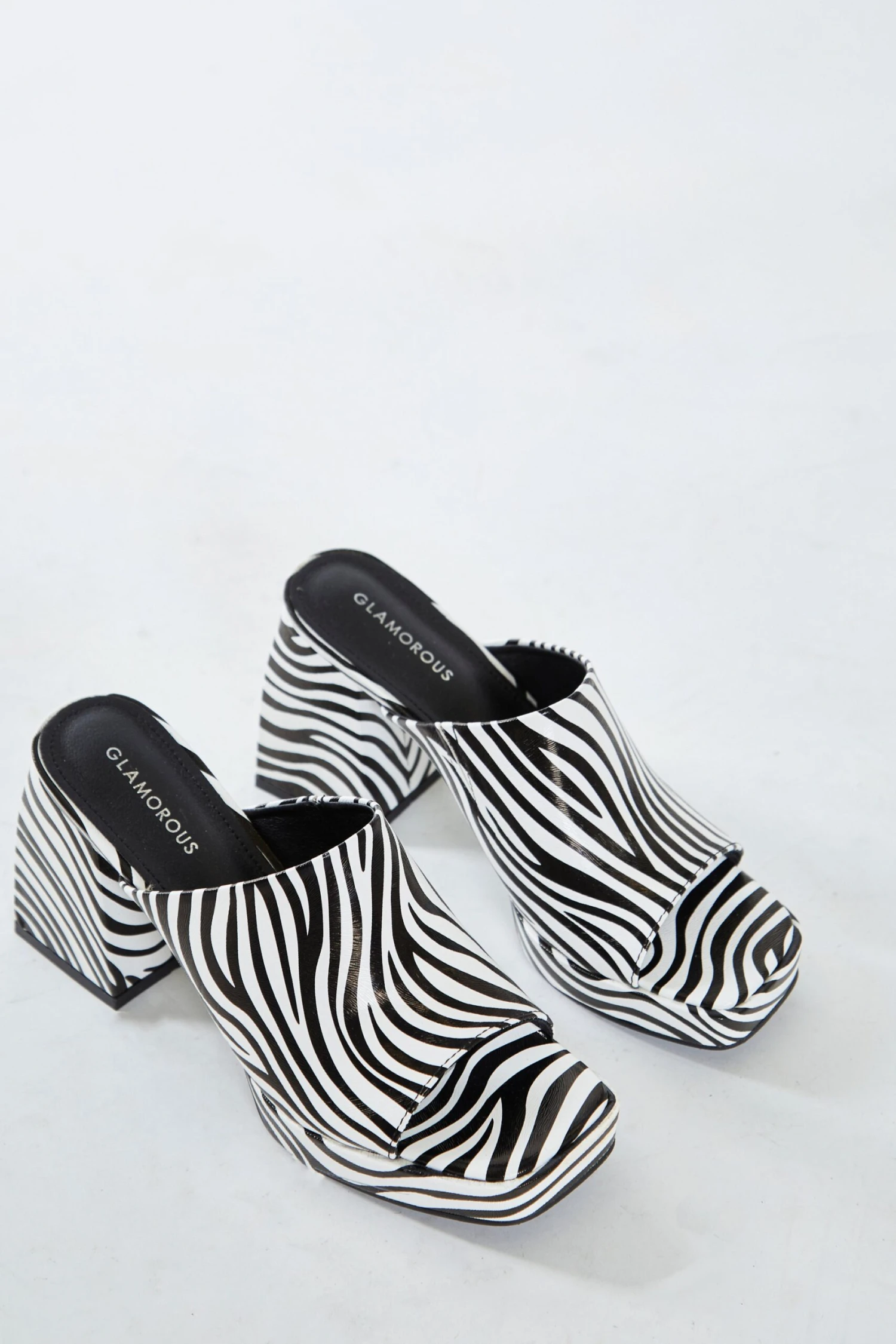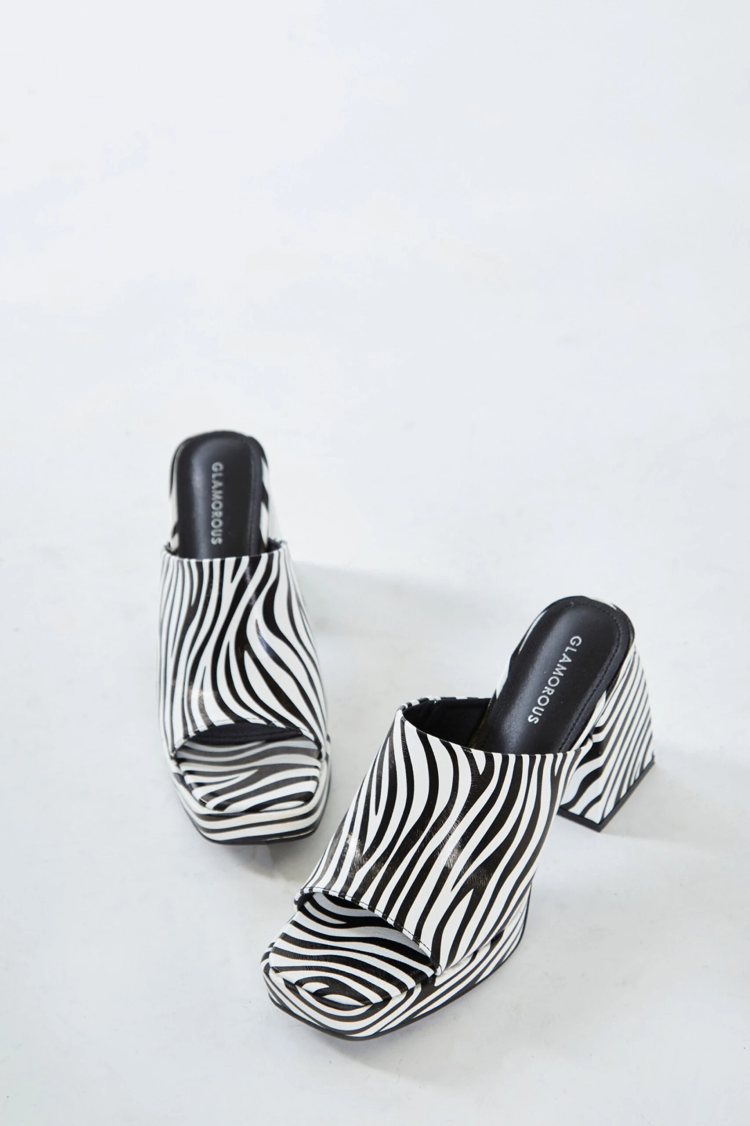 Glamorous Zebra Print Block Heel Mules. Its time to refresh your summer wardrobe with these gorgeous zebra print heels. Featuring a block heel with a slip-on mule style in a bold zebra print, theyre our new season must-have. Designed to make a statement, these heels are sure to elevate every outfit! Â