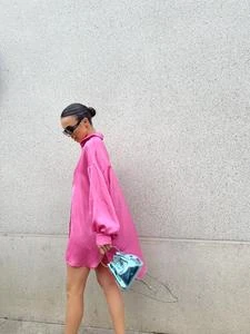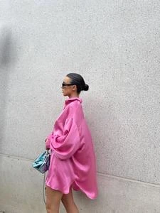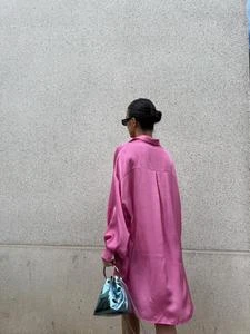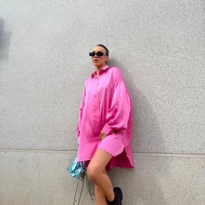Glamorous Women’s Pink Sateen Oversized Mini Shirt-Dress. This classic shirt dress in a refreshing pink sateen fabric is destined for your wardrobe this season. Featuring button front detail with long sleeves and a flattering oversized relaxed fit, this mini dress will look great on you! Pair with some chunky loafers for the perfect daytime outing this season.